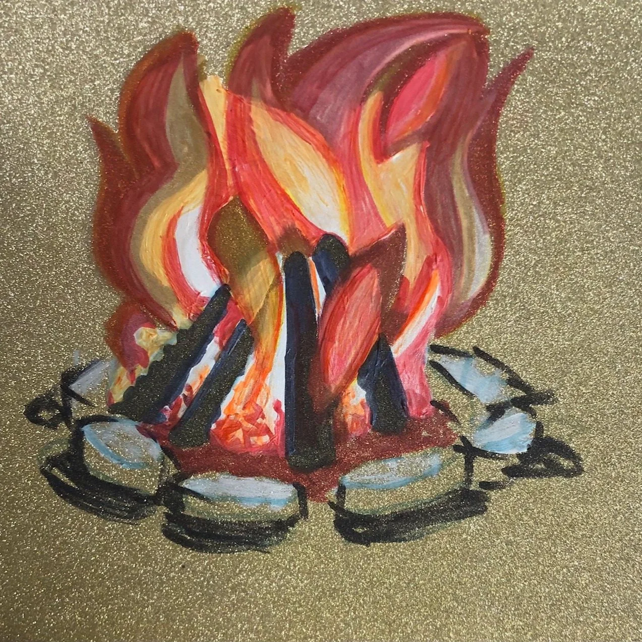 A white paint base coat can offset marker from the glitter background as if delivering a special effect. Using a white paint base, materials can be layered to build a fire. Resurfacing the dried painted area with a fine glitter powder medium enhances the offset. The same approach serves a basic, stylized, or dramatic fire drawing.